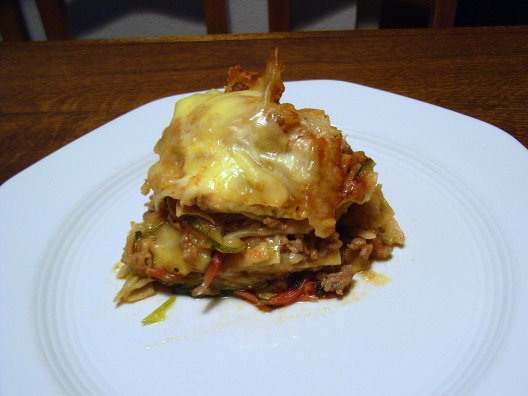 Glasauflaufform ,-tröpfchen Öl, Nudelplatten einlegen,Mangoldblatt drauf darüber dünn Zucchini und Kartoffel Scheiben( mit glasierten Zwiebelchen und Schweine/Rinderhack)egalisieren, etwas Käse einhobeln.Wieder Mangoldblätter , dann Nudelplatten wieder Zucchini/Kartoffel,usw. bis 10 o.12cm Form voll.Letzte Lage Hack/Kartoffel/ Zucchini mit Käse abdecken, Deckel drauf und bei 180 gradgolgelb (ich mit Umluft) ausbacken.