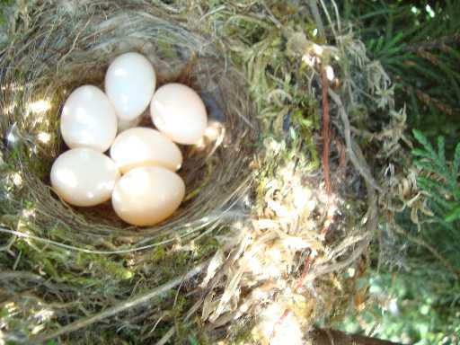 Hier mal ein Einblick ins Grünfinkennest.Sollten die Eier nicht eigentlich braune Sprenkel aufweisen?