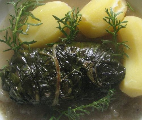 heute gab es gefuellte mangoldwickel. die fuellung bestand aus gekochten und klein geschnittenen mangold-stielen, gehackter zwiebel und schweinehack. garniert wurde mit maca.
