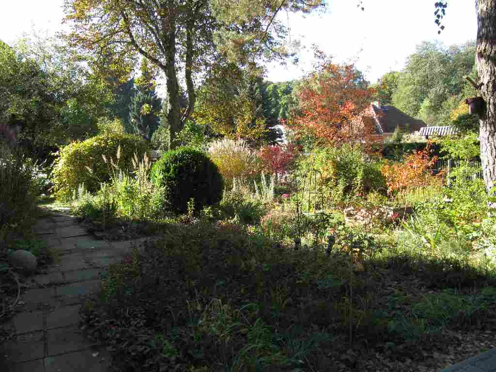 Hallo OileIch finde Deinen Vorgarten eigentlich auch recht schön. Gemessen am 0815 Vorgarten ist die Vielfalt in Deinen sogar vorbildlich. Wenn du sagst, dass du mit ihm haderst, schau ich natürlich, was es seien könnte, dass Dich stört. Mir fällt auf, dass die im Bild hinten liegende Hälfte sogar sehr schön aussieht! Die Fläche im Bild-Vordergrund sieht recht unruhig aus, viel Klein und Klein scheint mir. Was Dir hier fehlt sind einige Leitgewächse (die hast du in der anderen Hälfte und sie machen es schön!) Vielleicht genügt es, eine kleine Gruppe von Pflanzen mit sehr ordentlichem Charakter (K.Foerster: "Ordnungshelden") zu setzten, die Ruhe und Schwerpunkte in das Beet bringen. Sowas wie drei große Fetthennen, eine Gruppe Funkien, drei Buchskugeln, ein Viburnum davidii. Nur so als Beispiel, kenne Deine Standortbedingungen ja nicht.Ich hadere sehr oft mit meinem Vorgarten, aber gestern, im milden Oktoberlicht war ich doch recht angetan.