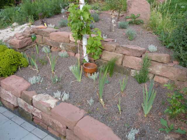 Die erste "Etage" wurde mit Iris (Maid of Orange), Rosmarin "Frankfurter Typ", Weinstock "Arkadia", und als Zwischengrauer Cerastium tomentosum var. columnae bepflanzt. Dazu kam noch die Kletterrose "Sutters Gold Climbing", wenn sie es denn ist. Blüten kommen erst noch.Auf der oberen Etage ist Lavendel gesetzt, dazu eine Spornblume und ein rotlaubiges Sedum (Name grad nicht parat)