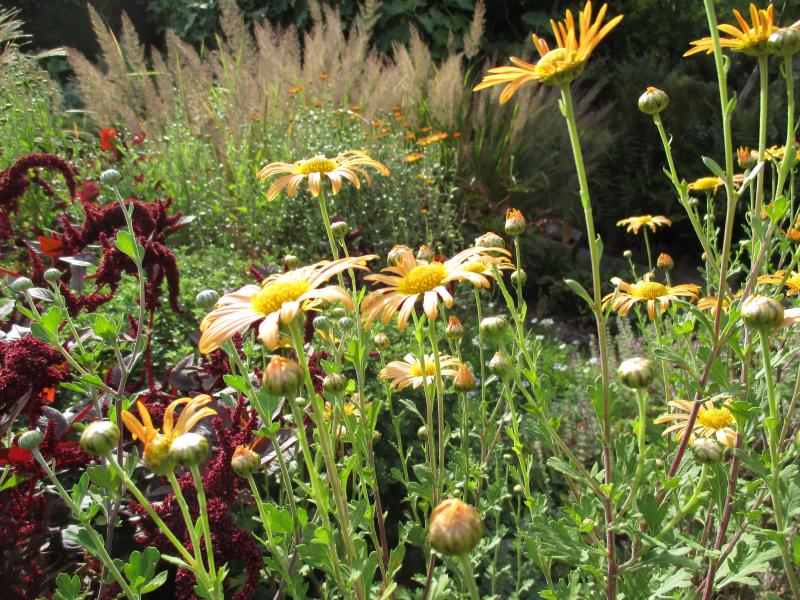 Das Beet steht kurz vor der Chrysanthemenblüte, 'Anastasia', 'Herbstbrokat' und 'Paul Boissier' zwinkern schon.