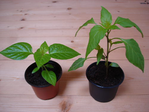 Interessant ist, wie unterschiedlich Chilis im Habitus sind.Hier sieht man Trinidad Perfume (C. chinense) und Czechoslovakian Black ( C.annuum) nebeneinander, beide 6 Wochen alt, gleich gezogen.