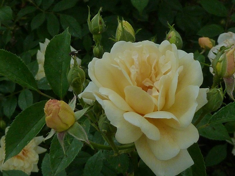 Manu, Thisbe hat sich hier in 6b bisher auch bewährt, für eine Moschata wenig Frostschäden.Die Stacheln sind allerdings nicht ganz ohne und bei dem eher ausladenden Wuchs sicher nicht zu vernachlässigen.Sie blüht ohne Unterbrechungen bis in den Spätherbst hinein und läßt sich auch durch späten SRT im Traufbereich eines Holunder im HS darin nicht beeinträchtigen. Blüten neben Hagebutten gleichzeitig.Noch ein Bild für die Vorfreude: