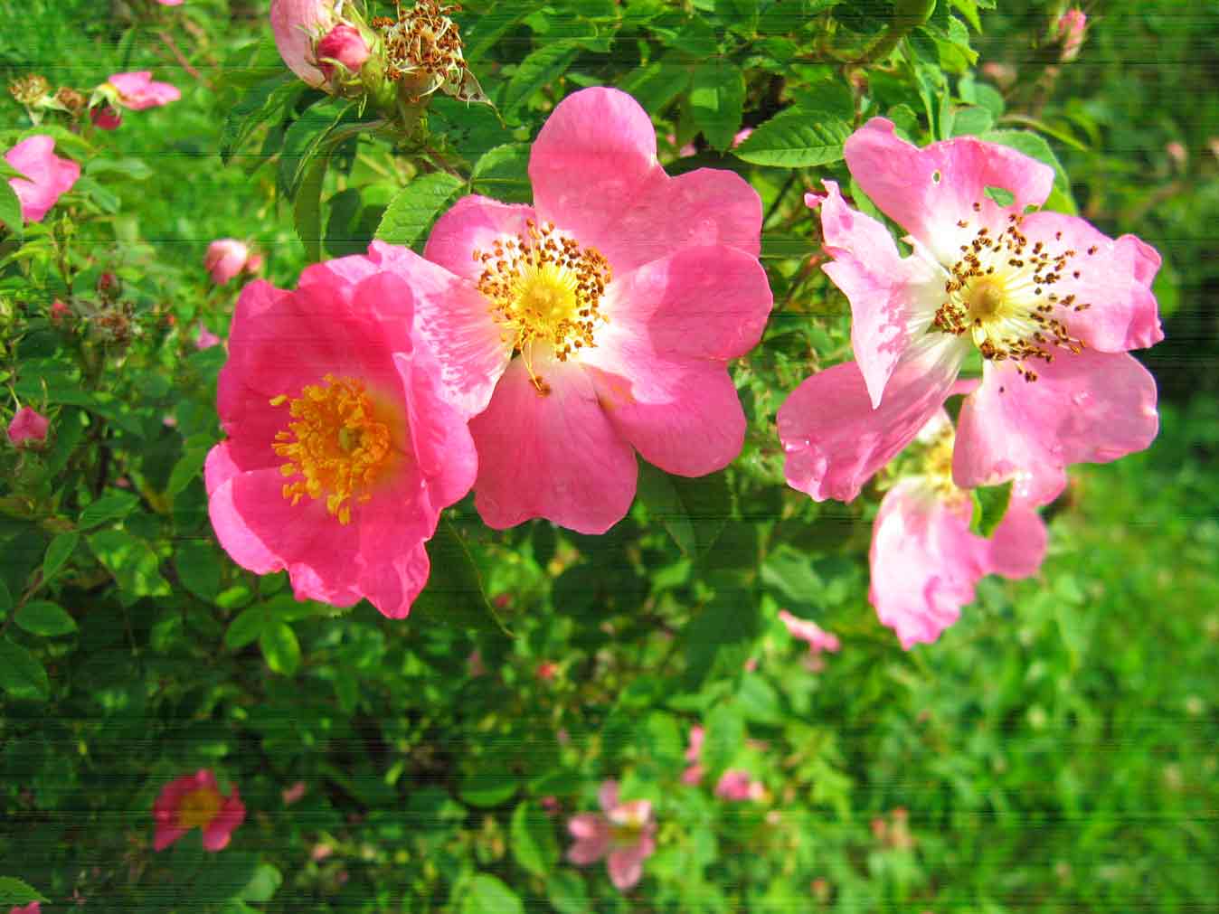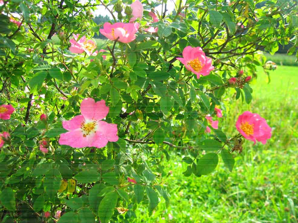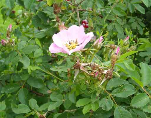 Ein wetterbedingt schlechts Bild von Rosa andersonii. Sie hat ein kräftiges Lachsrosa und wächst dichter als Rosa canina.