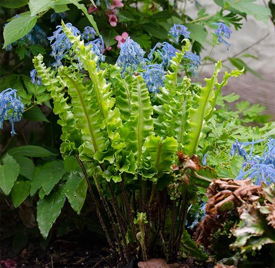 Welche Bezeichnung ist denn im Moment gültig, Phyllitis oder Asplenium ?Bei mir legen sie auch los.Von dem habe ich gerade unter der großen Eibe zehn Stück gepflanzt. Ich bin gespannt, wie das in ein paar Jahren aussieht.Im Schatten unter den Eiben wächst auch Phyllitis scolopendrium gut, hier ein 'crispum'-Exemplar.