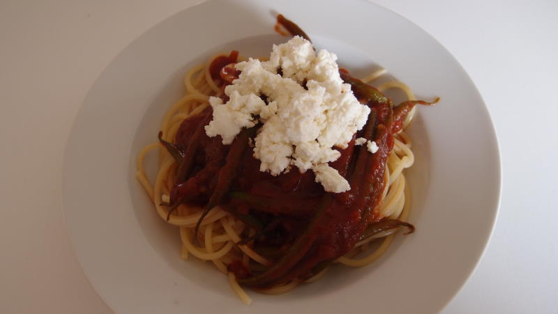 mittwoch spaghetti mit grünen bohnen in tomatensoße und schafskäse drüber.