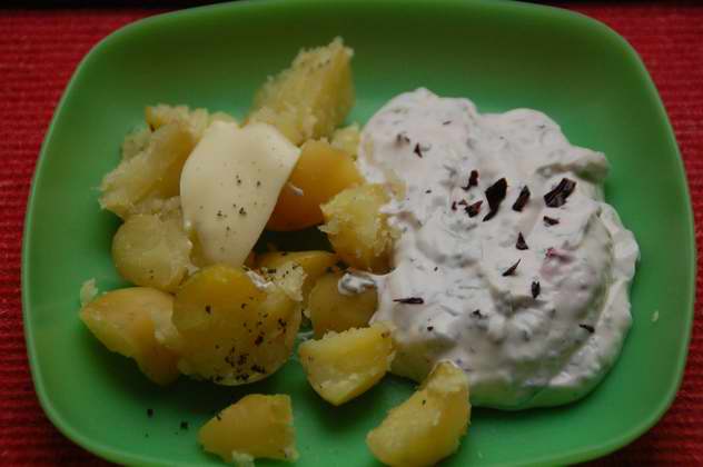 . Gibt es eine Anleitung für die Butter?Hier gab es Pellkartoffeln mit Kräuter-Leinöl-Quark (Quark, Leinöl, Milch, Salz, Salbei, Petersilie, Kapuzinerkresse, Süßdolde, Ruccola, Rotebeteblätter). Die schwarzen Punkte auf den Kartoffeln sind Hawaisalz.