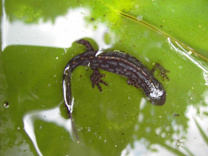 Letzte Woche habe ich dem vom Vorbesitzer übernommenen kleinen Fertigteich ein paar Eimer zusätzliches Regenwasser gegönnt, da der Wasserstand ziemlich abgesunken war. Und siehe da - ein Molch hat sich bedankt.