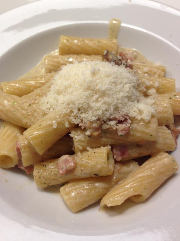 Wir hatten Nudeln mit schinkenpilzsahnesoße mit Parmesan und ackersalat