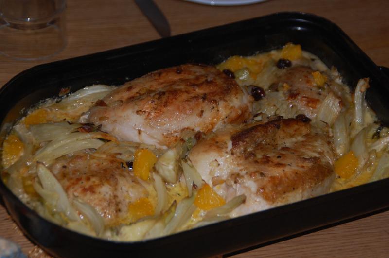 Gestern gab es Hühnchen in Orangen-Fenchel-Sahne mit roten Linsen.