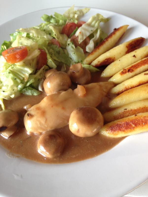 Heute die restlichen Champignons aufgebraucht. Schupfnudeln mit champignonsosse, hähncheninnenfilet und salat