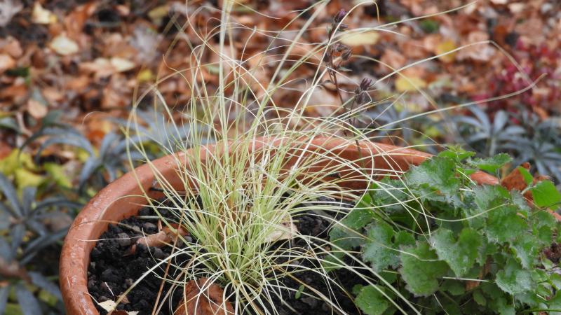 Noch winzig und zum Überwintern dann wohl besser an die Hauswand; Carex comans `Frosted Curls`