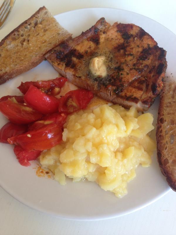 Gestern Holzfällersteak, schwäbischer Kartoffelsalat, Tomatensalat, Brot mit Knoblauchbutter