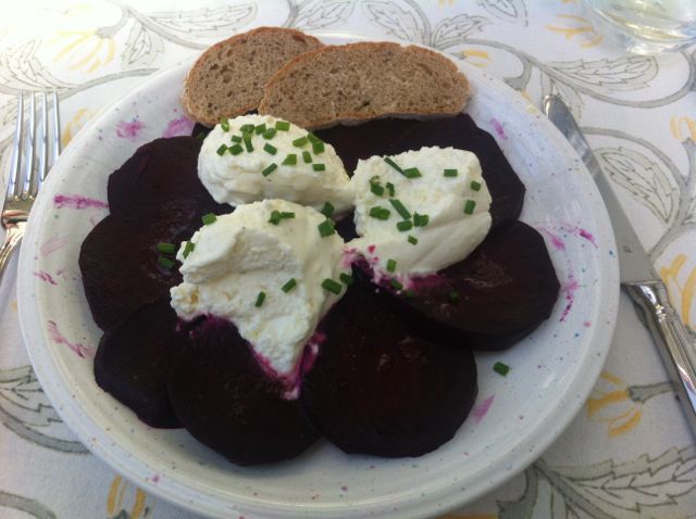 Als Vorspeise Graukäsemousse mit Rote Bete, dann Ochsenschwanzragout mit breiten Nudeln und Salat.