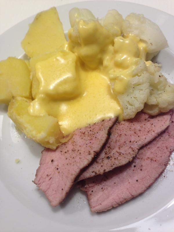 Kalbsbraten, Blumenkohl, Salzkartoffeln, Holländische Soße