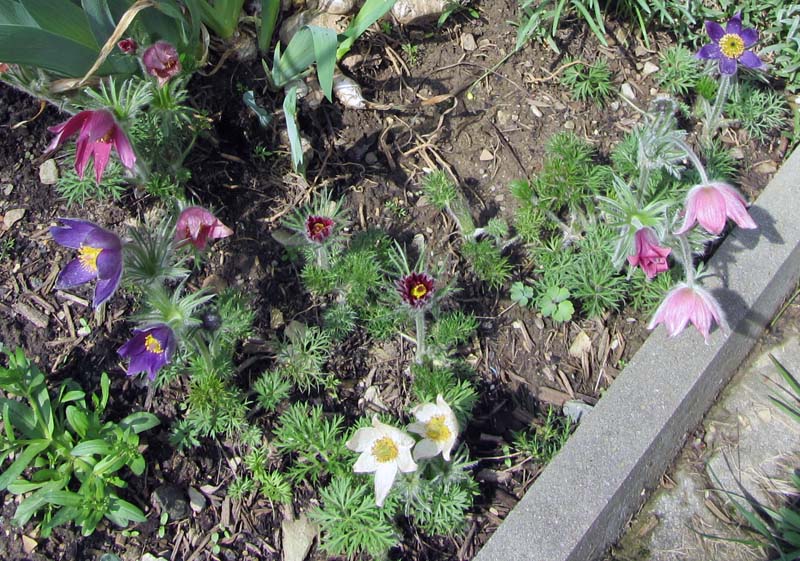 Die weissen Küchenschellen sind schon am verblühen während der lilane Sämling grad anfängt zu blühen. Wobei der auch begraben unter dem umgestürzten großen Zylindropuntia lag, den ich erst letzte Woche auf die Seite gezogen hab: