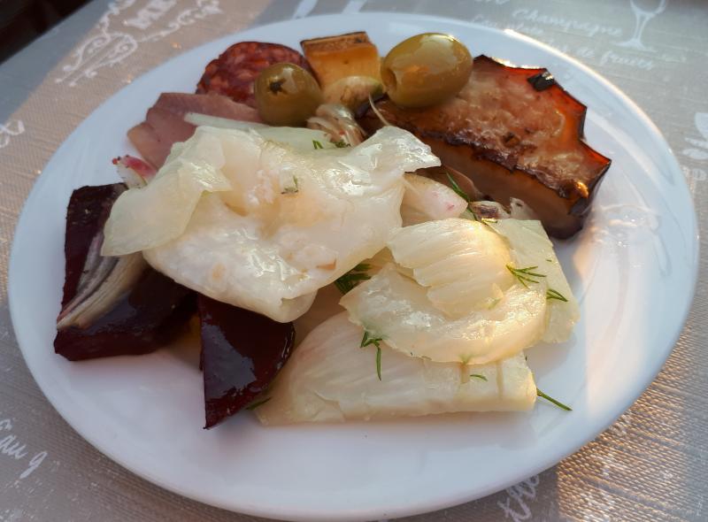 Hier gabs Dorade mit mediterranem Gemüse und Ofenkartoffel