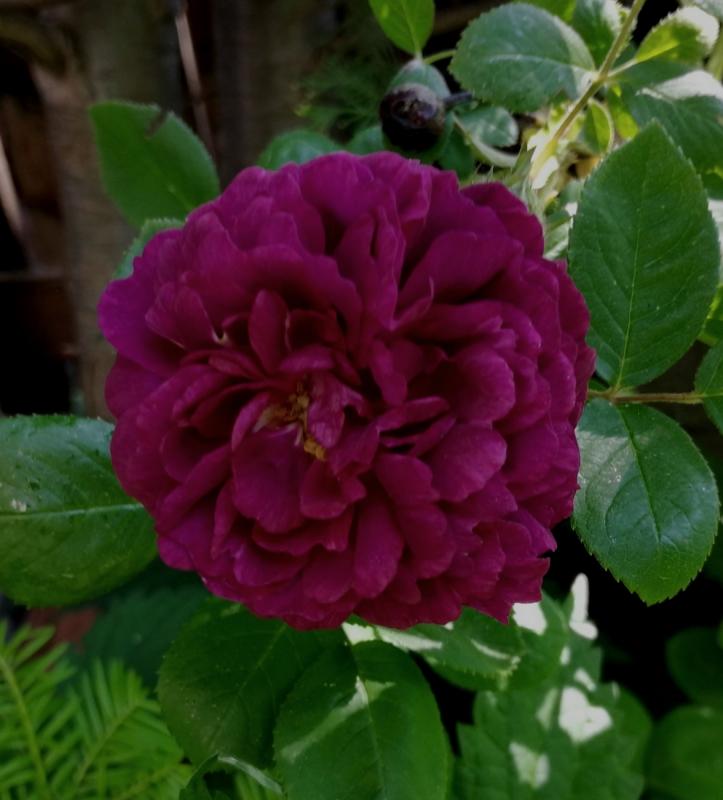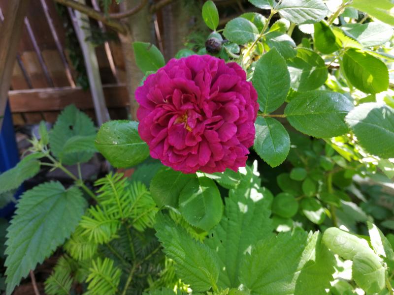 Meine drei Rose de Resht machen sich hier den Umständen entsprechend gar nciht so schlecht, aber der Regen hat viele Knospen faulen lassen :( Aber der Zigeunerknabe (ob der auch irgendwann einen anderen Namen bekommen wird :-X) macht mir grade so viel Freude, daß ich noch ein Bild zeigen muß - das Farbspiel von Rubinrot bis ganz dunkel ist umwerfend: