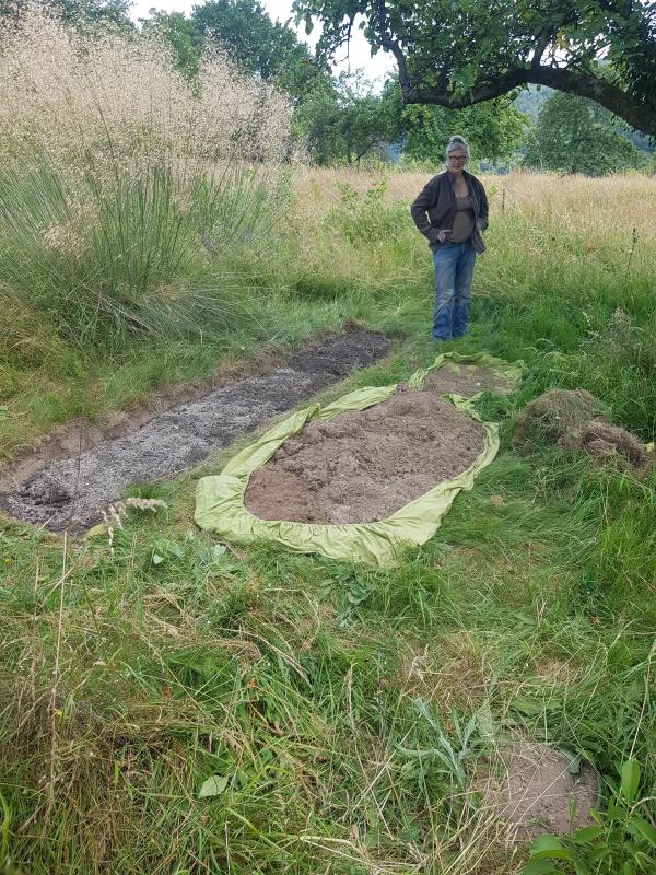 Sehr trockener Boden. Rasen mit dem Polet Rodespaten umbrechen. Die Erde von den Rasensoden mit Schweizer Gertel abtrennen. Eine Kompostmischung auf das Erdreich und Jurakalksplitt 8/11 drauf. Außerdem ein Rest Volldünger und Hornspäne. Ein grünes altes Bettlaken um die Erde nicht an den Rasen zu verlieren.