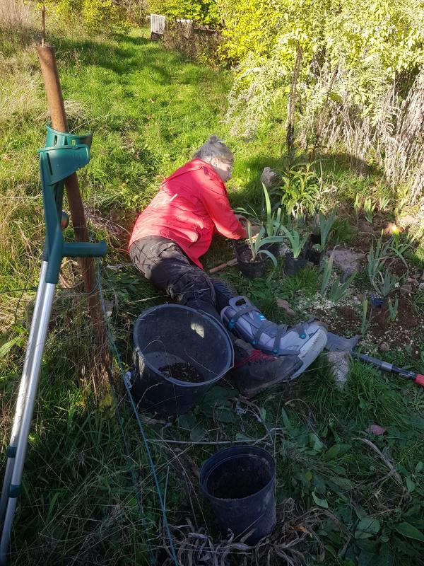 40 Iris habe ich letztes Jahr am 2. November 2022 mit der VACOped Fußorthese, den NoCry Professionellen Knieschonern, Krücken und einer treuen Begleitung gepflanzt. Liegend in der Matsche.