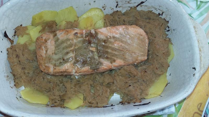 - Lachs auf Sauerkraut und Kartoffeln als Auflauf.