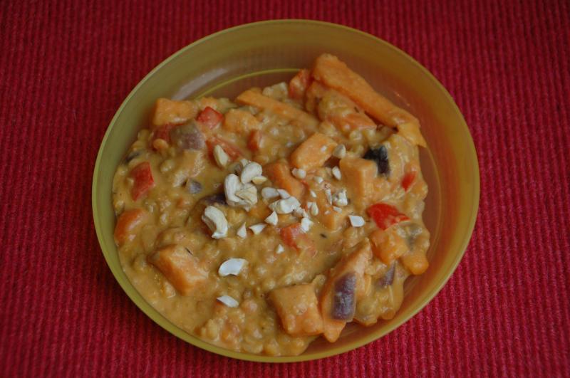Kochen nach Farbe: oranges Curry (Süßkartoffeln, rote Zwiebel, Knoblauch, rote Linsen, Kokosmilch (diesmal die Bio~ von Rewe - bin zufrieden damit ;)), roter Paprika, rote Currypaste, Kreuzkümmel, Salz, langer Pfeffer, Öl, Cashewkerne)