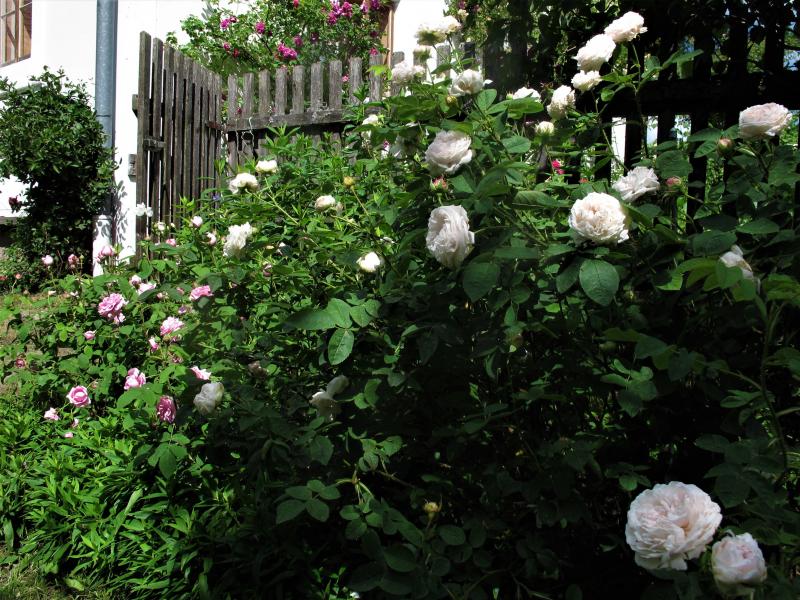 Mein Rosentempel ist jedes Jahr wieder so schön. Da ist links die Meidiland alba, eine Bodendeckerrose, die so 4-5 m hoch wird und die Unschuld von Wänninger. Die beiden machen mir richtig viel Freude.