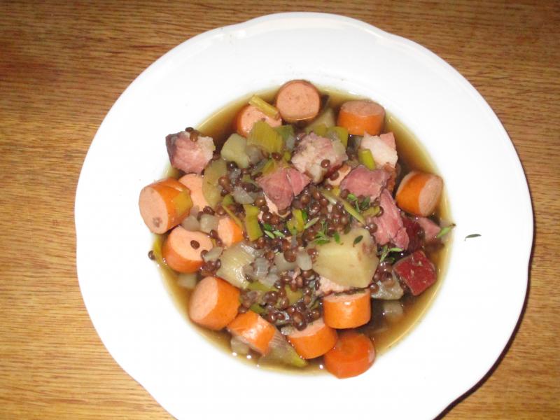 Heute gab es Irischen Linseneintopf (Belugalinsen, Schwarzbier (Stout), Kassler, Wiener Würstchen, Gemüsebrühe, Kartoffel, Möhre, Zwiebel, Porree, Sellerieknolle, Thymian, S&P). War gut, hab aber trotzdem noch ein bissel Essig auf meinen Teller gemacht. Kann bei Linsen nicht anders :( :).