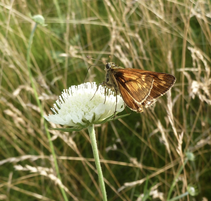 Hier habe ich eben einen Dickkopf auf einer Scabiose erwischt. Ein Rostfarbiger Dickkopffalter?