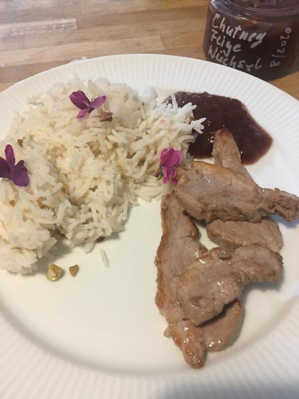 Kurz gebratener Schweinslungenbraten (Filet), Reis mit Pistazien und Viola odorata, Chutney, Salat.