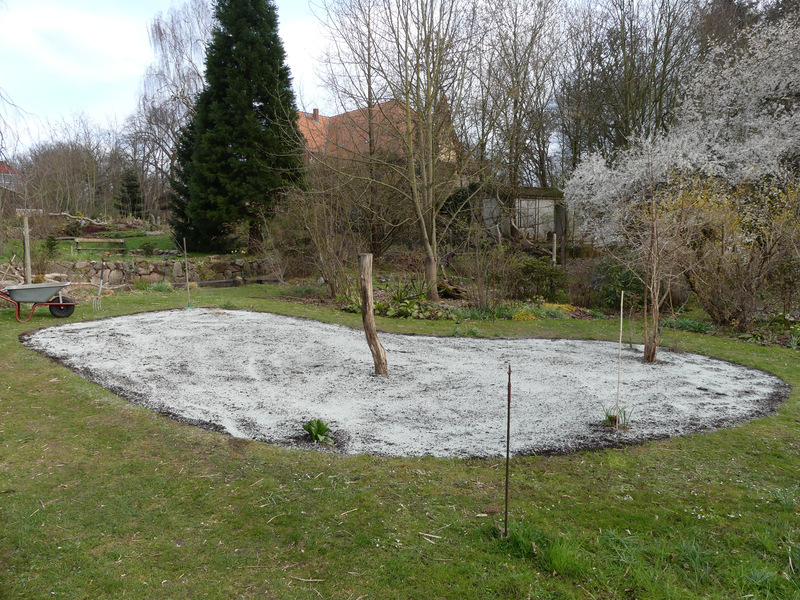 Ja, der Sandboden... Ganze 18 Schubkarren Kompost habe ich auf der Fläche verteilt, bevor es schneite. ;D Nein, damit das Wasser etwas besser gehalten wird, sind zwei Zentner Bentonit auf die Fläche gekommen. Anschließend habe ich alles mit der Grabegabel durchgebuddelt, weil es morgen wieder Regen geben soll und das sonst eine klebrige Angelegenheit würde. :P