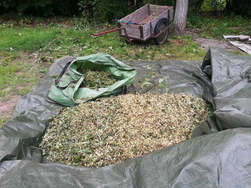Nur einmal das graue Wägelchen vollgepackt. dann habe ich noch einen riesigen Philadelphus halbiert - die andere Hälfte lass ich mir für ein andermal. Dann den Hexler rausgezerrt. Er ist schön angesprungen und ich habe bestimmt 120 Liter Häcksel produziert. Vor und nach dem Hexler musste ich aber jeweils ausruhen. Zum Glück war es aber nicht so warm.