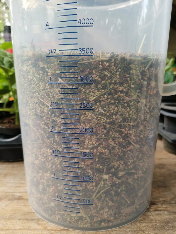 Die Tage war es dann soweit, die Samen sind ausreichend abgereift und es fing schon an mit ausfallen. Deshalb den Feldsalat runter vom Beet, in Schubkarren nachreifen lassen. Gestern das erste mal gedroschen. Sind schon wieder 2 Liter Saatgut. Das wird für viel Begrünung reichen.