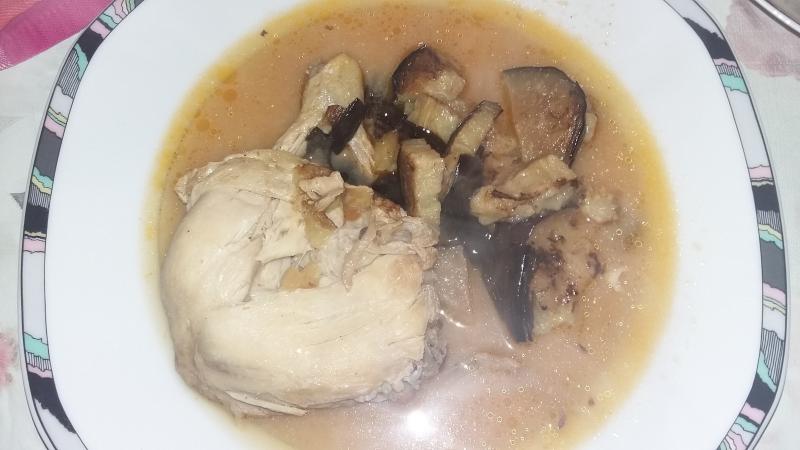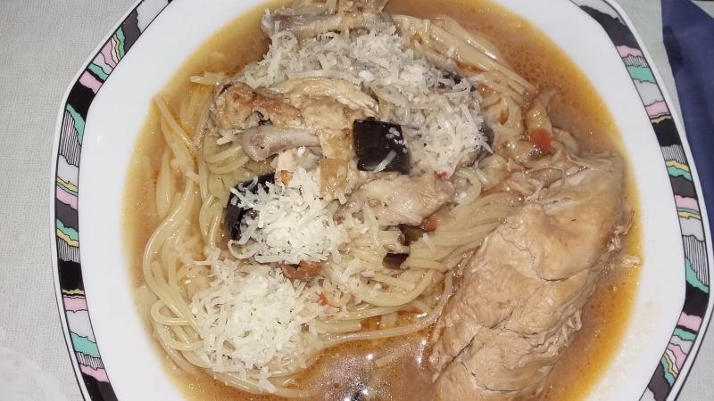 Das Hähnchen wurde zerlegt und die Teile angebraten. Anschließend wurden sie in einem Sugo (Zwiebeln, Möhren, Sellerie, Chili und Tomaten) gekocht; zum Schluß kamen noch gebratene Auberginen hinzu.