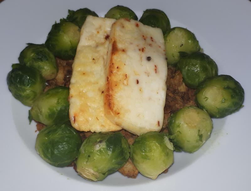Ich wollte aus dem Rest Stampf von neulich Bratlinge (mit Linsen, Ei, Petersilie, Käse, Seitan, Sonnenblumenhack) machen. Leider sind sie auseinandergefallen. Also habe ich sie krümelig gebraten. Dazu gab es Rosenkohl und gebratenen Halloumi, auf Wunsch Tzatziki , Endiviensalat