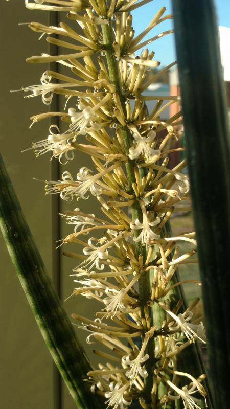 Hier wurde ja schon lange nichts mehr geschrieben. Ich habe auch einige Sansevieria, die meisten im Büro, weil die gießbeauftragtenfreundlich sind. ;D Seit einer Weile bahnte sich schon eine Blüte an bei der Pflanze die ich mal als Sansevieria 'Boncellensis' bekam. Nun nach Ostern wurde ich heute von geöffneten Blüten begrüßt. Heute Vormittag war noch ein schwacher Duft wahrnehmbar. Bis zum Mittag waren die geöffneten Blüten verblüht. Am späten Nachmittag öffnete sich die nächste Flotte und verströmte gegen Abend ihren kräftigen Duft im Büro. :) Der Blütenstand misst 60 cm.