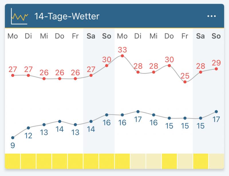 Immer warm bis heiß mit Knallsonne und kein Regen, derzeit 23 Grad.
