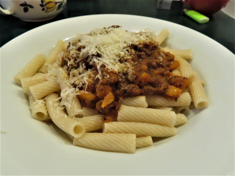 Mindestens genauso gut ist die Resteverwertung, deretwegen ich immer etwas mehr koche: Zwiebel gelb rösten, eine Hand voll Butternußwürfelchen und 2-3 El Tomatenmark kurz mitschmoren, mit etwas Wasser/Suppe aufgießen, dazu frischen gehackten Rosmarin, etwas Chili und eine Prise Zimt; wenn der Kürbis fast weich ist, kleingeschnittene Rehstückchen dazugeben und noch ein par Minuten sachte schmoren lassen. Am besten mit Maccheroni oder Penne und einem Blattsalat (heute Zuckerhut und Radiccio).