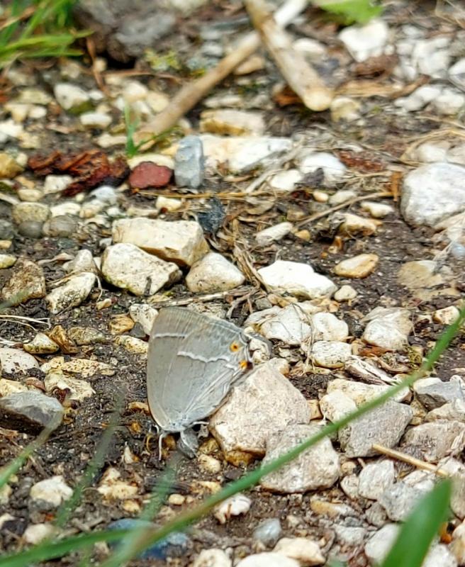 Die sind beide hier noch nicht da, dafür dieser hier - Pflaumen-Zipfelfalter, Satyrium pruni. Die Raupen fressen an Schlehen, Pflaumen und Zwetschgen.
