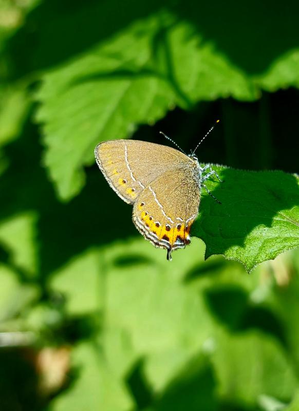 Ich denke es war ein Männchen. Wenn das Blau im Flug deutlich auffällt, ist es meist ein Männchen. Beim Weibchen ist das Blau weniger ausgedehnt. Auch die Unterseite mit dem schwarz gekernten orangen Fleck spricht für ein Männchen. Der Falter ist wie alle anderen Falter hier selten geworden. Vor Jahren konnte man ihn auf Waldschneisen mit Eichenbestand noch regelmäßig sehen