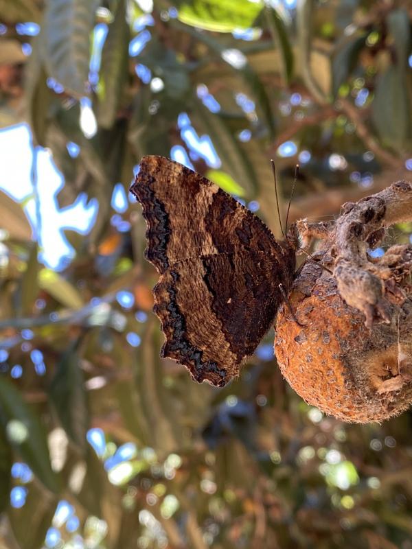 Gestern habe ich mit dem Handy diesen Schmetterling fotografiert, war nicht schwer, weil er an der Frucht wie angeklebt war. Leider nur mit geschlossenen Flügeln, nur kurz habe ich die rot-orange Innenseite gesehen: