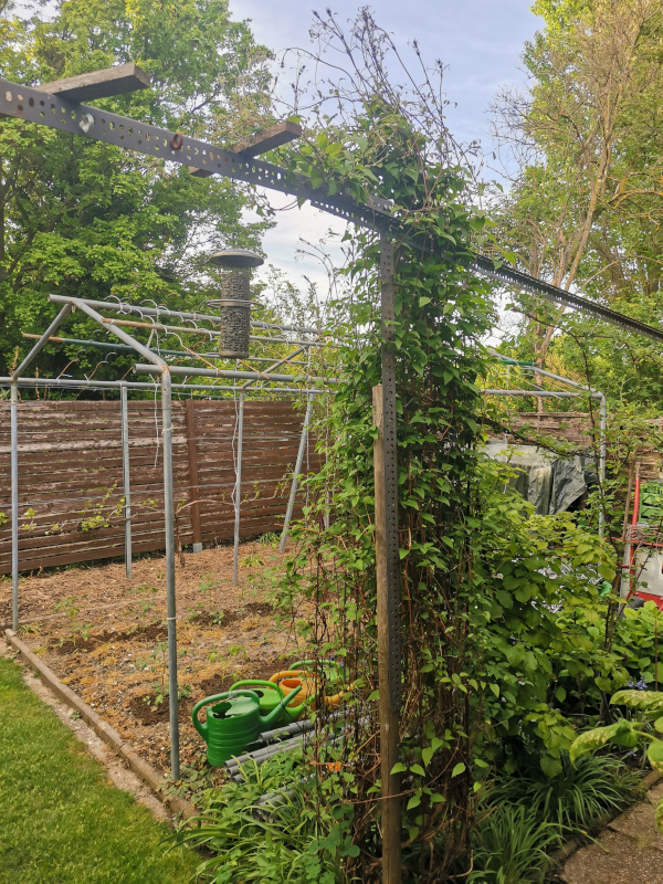 Bodenschraubhülse mit Holzpfosten, daran die Winkel von einem Schwerlastregal. Die Löcher darin brauche ich, wenn geräuchert wird zum aufhängen von Fisch/Fleisch. Auf dem Foto erkennt man es noch ein bisschen. Rechts daneben hinter der Kletterhortensie wächst eine Taybeere, die an einer Kette bzw dem Gestell quergezogen wird.