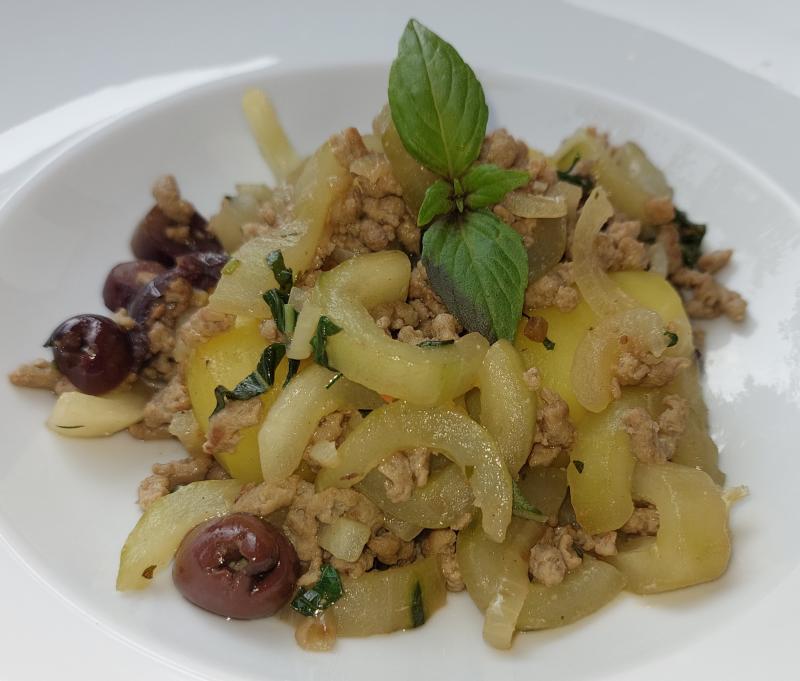 Kartoffeln und Schmorgurken mit Zwiebeln, Oliven und Basilikum, Tomatensalat
