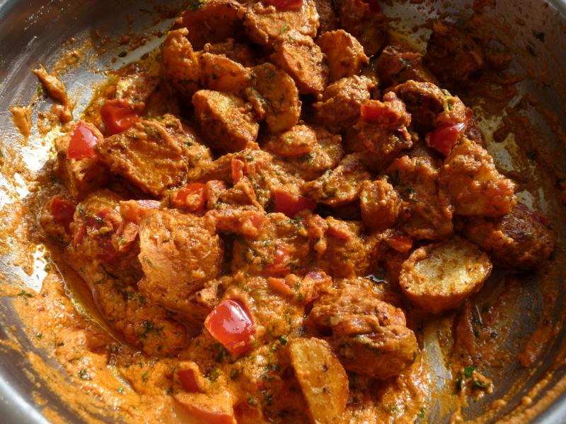 Kartoffeln mit Gewürzen, Harissa und Öl backen - dann in einer Soße aus Harissa, Öl, Tomaten, Koriander, Zitrone und Tahini geschwenkt. So ganz grob.... :D