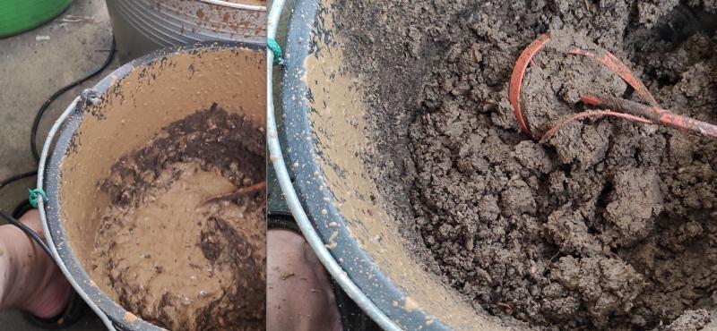 Zum Glück hat man ja Freunde mit guten Ideen. Lilo meinte ich soll mit der Bohrmaschine mit Rührhaken da ran gehen. Gesagt getan. Zwei Kellen Lehm in den Eimer, ordentlicher Schuss Wasser dazu und los geht’s. Danach hatte ich überall Sommersprossen. Je mehr Kompost dazu kam um so schwerer wurde es. Konnte nicht alles mit der Maschine machen, nicht dass die mir auch noch abraucht. Den Bodensatz dann noch von Hand mit mehr Kompost vermengt. Fühlt sich auch nicht so an als ob ich so 200 Liter zusammenkriege. Die hergestellten ca. 30 L Gemisch reichen gerade um die Beetfläche dünn zu bestreuen.