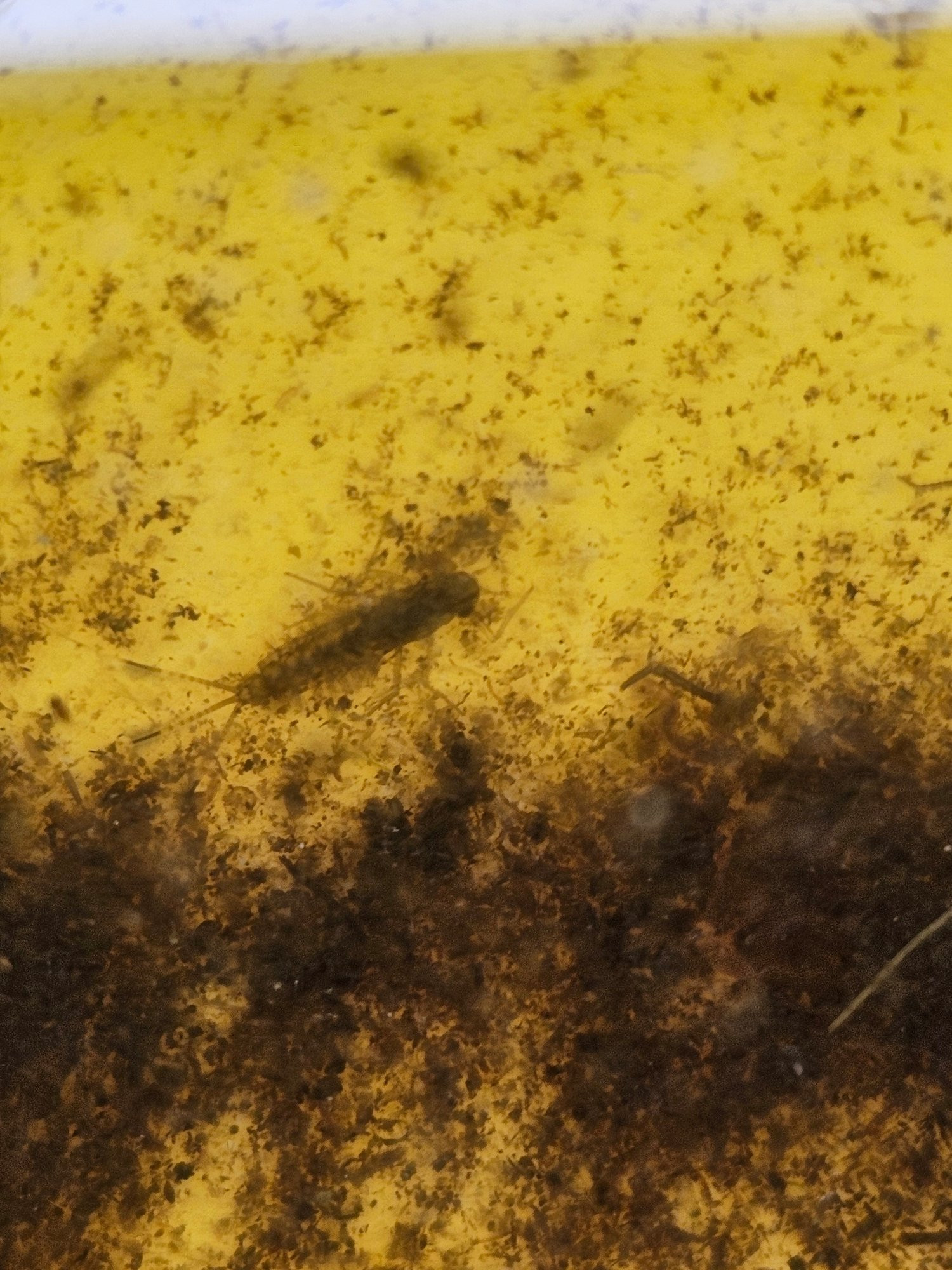 Auf dem letzten Foto ist eine Eintagsfliegenlarve zu sehen, die 3 langen Zipfel am Hintern sind typisch.