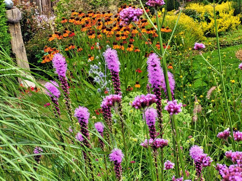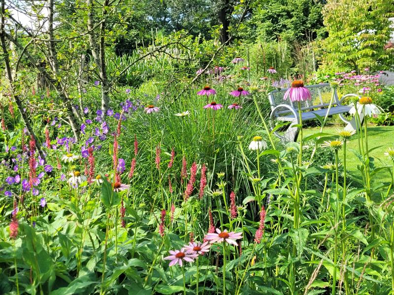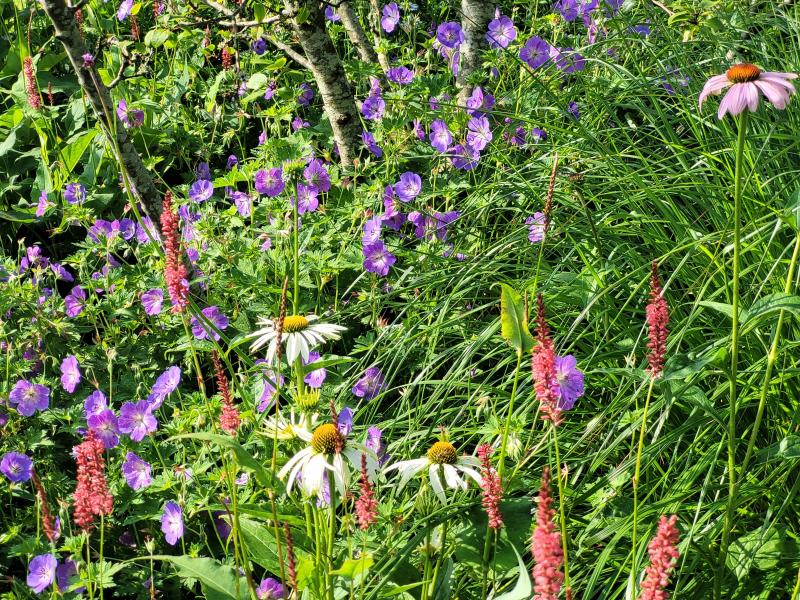 Echinacea purpurea & 'Alba', Bistorta amplexicaulis und Geranium 'Rozanne ' als Baumkletterer... :D