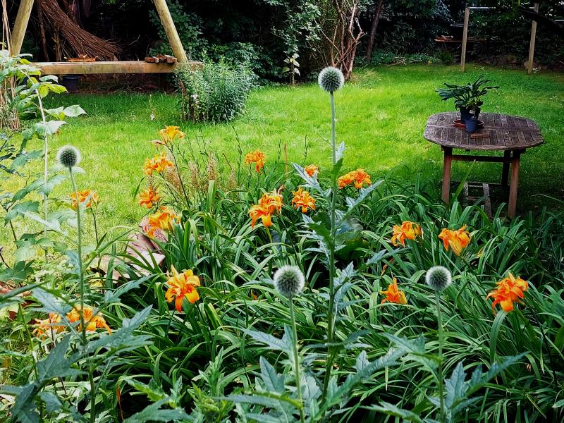 Das Taglilienbeet blüht dieses Jahr nicht ganz so üppig wie sonst. ( H. fulva)