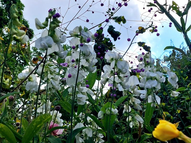 Die weiße Staudenwicke wächst und wuchert sich jedes Jahr durch und über Nachbarstauden, ohne diese aber wesentlich zu beeintraechtigen, sondern